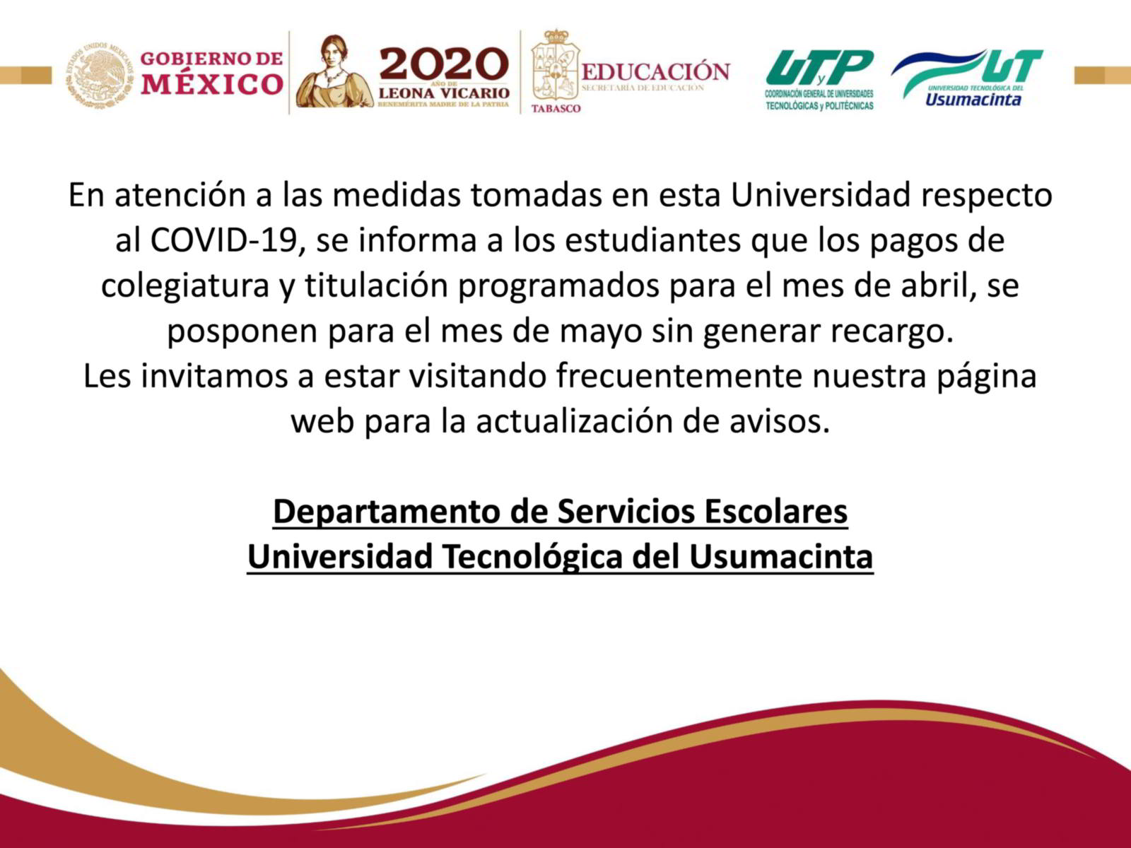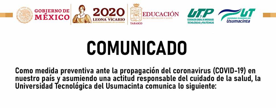 Ante la propagación del coronavirus (COVID-19), la Universidad Tecnológica del Usumacinta comunica lo siguiente: